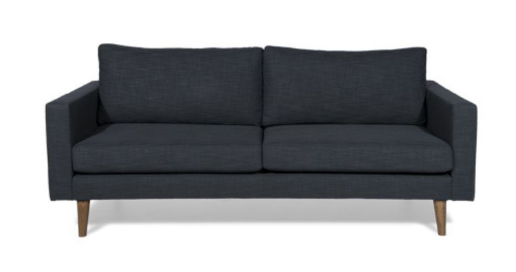 Loose base and back cushions with button detail and a metal square tubing frame. Other base options include a wooden leg frame or chromed sofa legs.