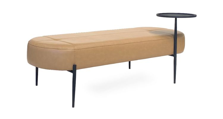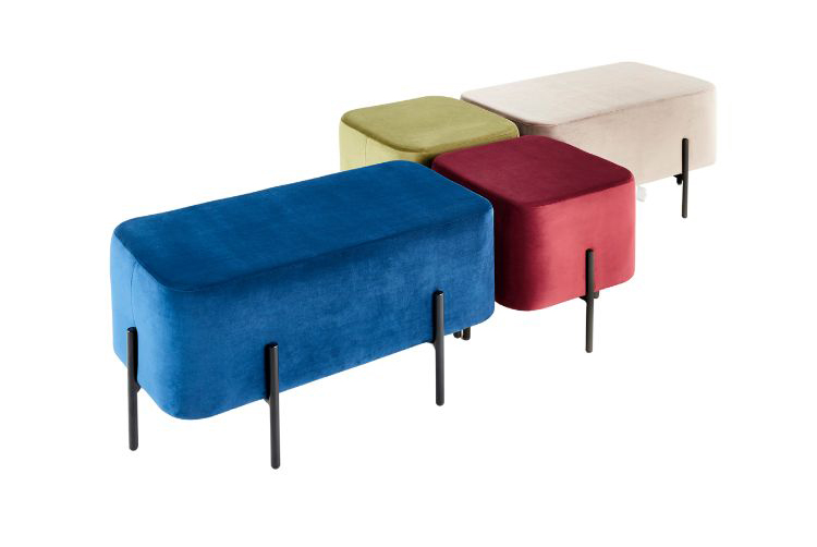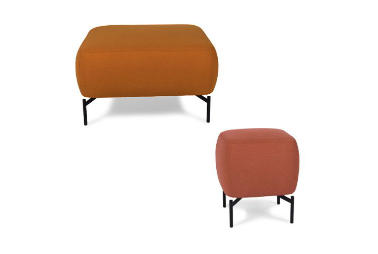 Upholstered ottoman made from high density foam, featuring steel legs, available in various powder coat finishes. Two sizes available.