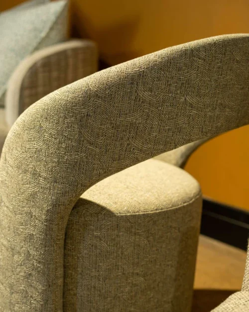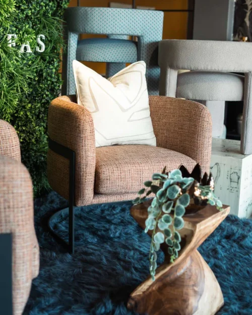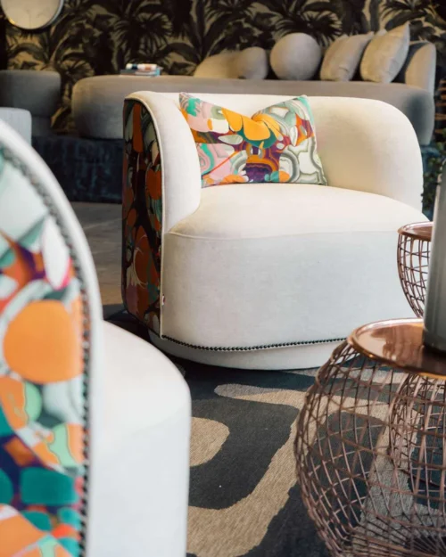 The Dineo Swivel Chair is a striking, contemporary accent piece that adds flair to any room. Featuring the artistry of Christian Lacroix on the out-back, this barrel-style chair combines comfort and modern design. Its curved backrest offering a natural contrast to the vibrant fabric upholstery. With a built-in swivel function, it provides both style and flexibility, perfect for living rooms,…